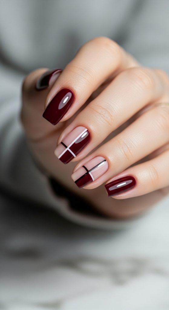 Geometric nail designs are perfect for those who love modern, clean aesthetics. Combining burgundy with nude tones in geometric patterns creates a chic and luxurious manicure that is both stylish and versatile.