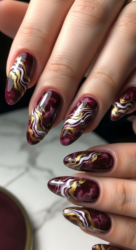 Marble nails are a trend that never goes out of style, and when paired with burgundy, the result is extraordinary. Burgundy marble nails combine rich shades with swirls of white, gold, or black, giving the illusion of luxurious natural stone.