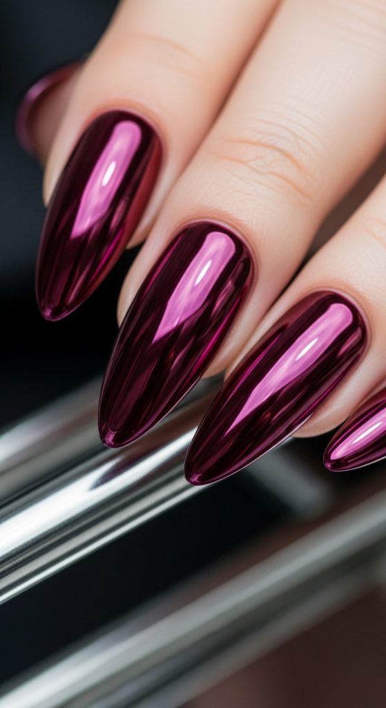 For a futuristic yet elegant twist, burgundy chrome nails are a showstopper. Chrome powders give nails a reflective, metallic sheen that instantly elevates the manicure to luxury status. Burgundy chrome works exceptionally well on medium to long nails and makes a bold statement without being flashy.