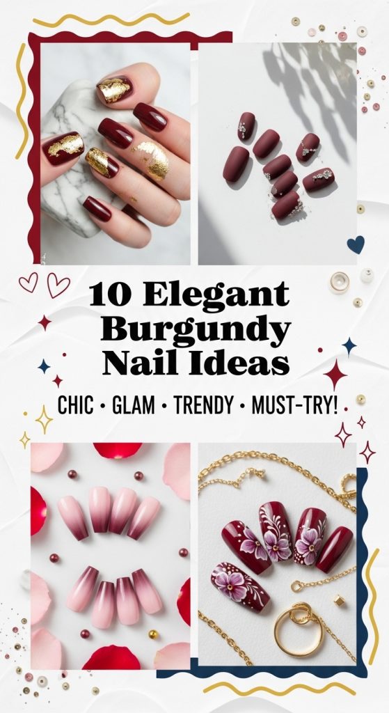 Burgundy nails are the epitome of elegance and luxury. From matte finishes to chrome, glitter, lace, and pearl accents, the possibilities are endless. Whether you prefer subtle sophistication or bold glamour, there’s a burgundy nail design to suit every style and occasion. These 10 ideas are perfect for anyone looking to elevate their nail game and make a lasting impression.