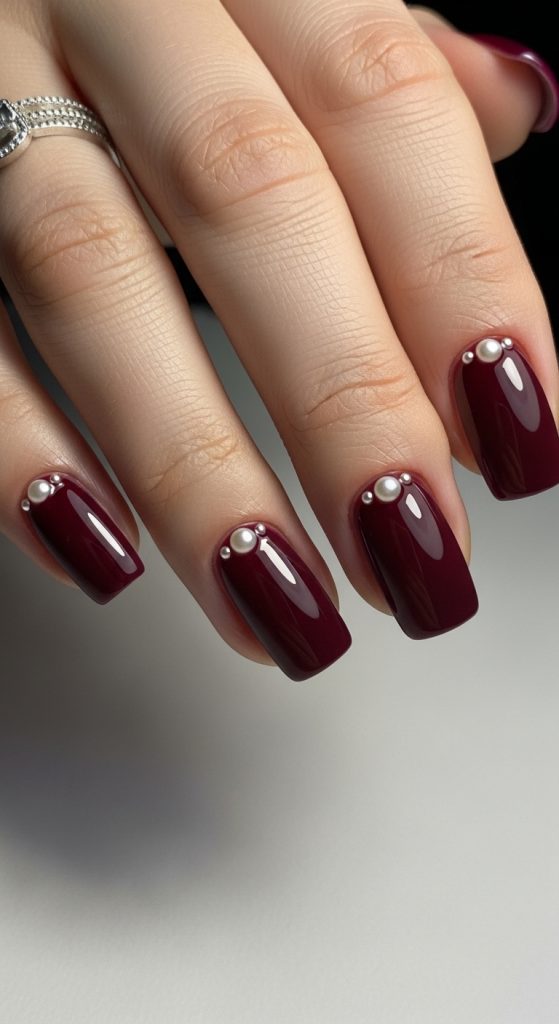 This manicure is perfect for weddings, anniversaries, or special events where a refined and feminine touch is desired. Pairing pearls with a glossy burgundy base or subtle glitter can further elevate the luxurious feel.