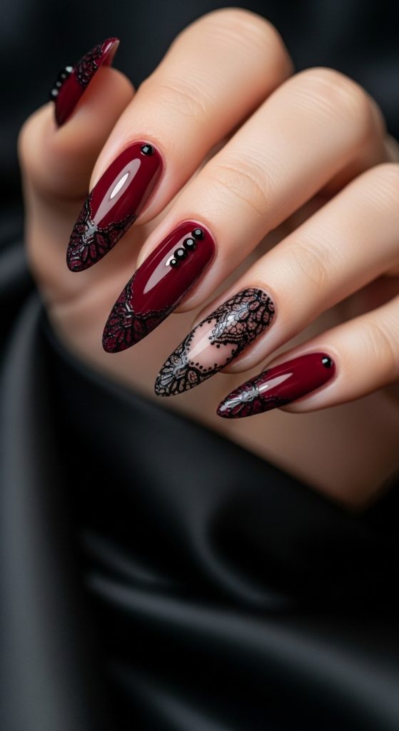 For an ultra-elegant and romantic vibe, pair burgundy nails with black lace designs. The contrast between the dark wine shade and delicate black lace patterns adds drama and sophistication. This manicure is perfect for evening events, date nights, or formal gatherings.