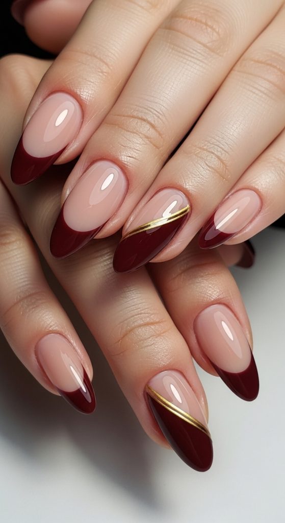 You can elevate the look further by adding tiny gold or silver lines just below the tips or by experimenting with subtle glitter. Burgundy French tips are perfect for everyday wear while maintaining an air of elegance.