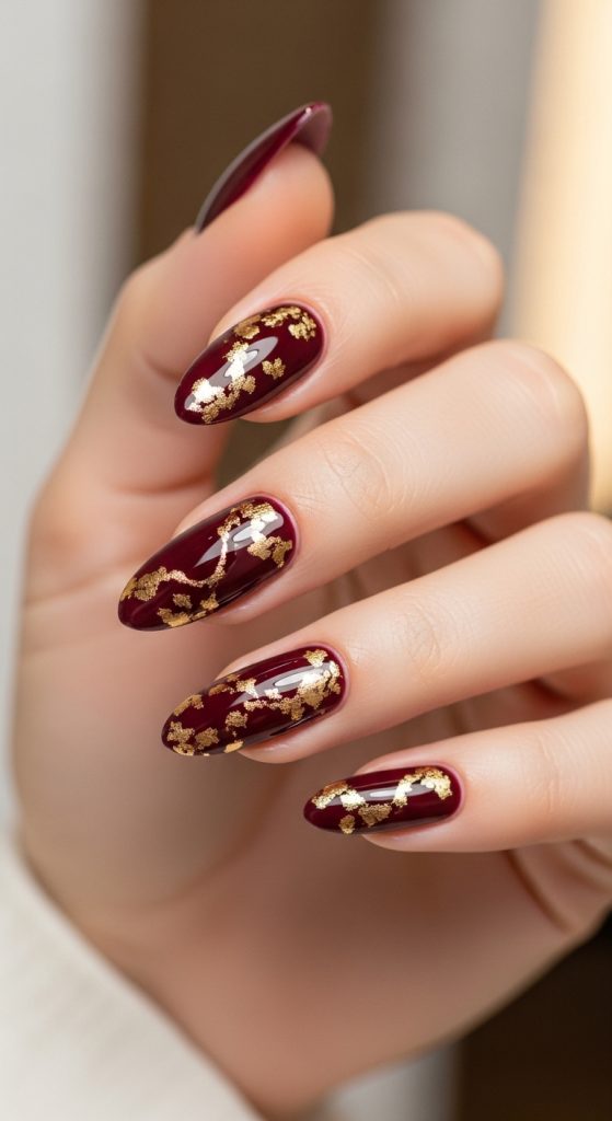 For a truly luxurious effect, combine burgundy nails with gold foil accents. The warmth of gold complements the deep, rich tones of burgundy, creating a regal and opulent appearance. These nails are perfect for holiday parties, weddings, or any event where you want your nails to shine.