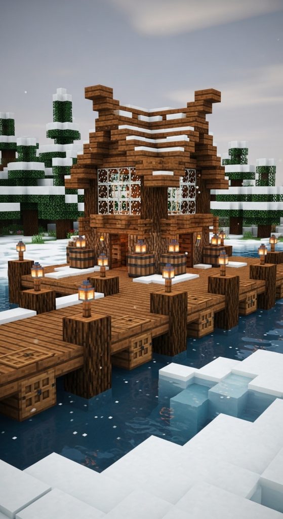 A simple wooden dock stretching onto a frozen lake instantly brings charm. Use spruce or oak planks with wooden fences for railings. Add torches or lanterns at intervals for a soft glow at night, reflecting beautifully off the ice. Incorporate a small bench or crate to make it feel like someone’s fishing spot.