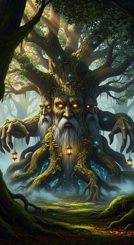 Imagine a giant oak tree in the heart of a mystical forest. Its trunk is thick and gnarled, branches twisting in unexpected directions. Hanging lanterns sway from the branches, illuminating hidden pathways and secret nooks. Surround it with flowering plants, mushroom clusters, and sparkling water pools to create an ethereal setting that feels alive with magic.