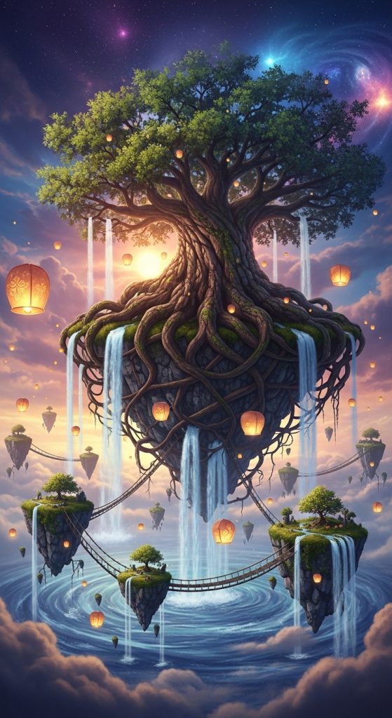 Defy gravity with a floating giant oak tree suspended in the air by magical means. Clouds or floating islands below can make it look like the tree is drifting in the sky. Waterfalls pouring from its branches into a small lake or cloud platform give it a serene, fantastical effect.