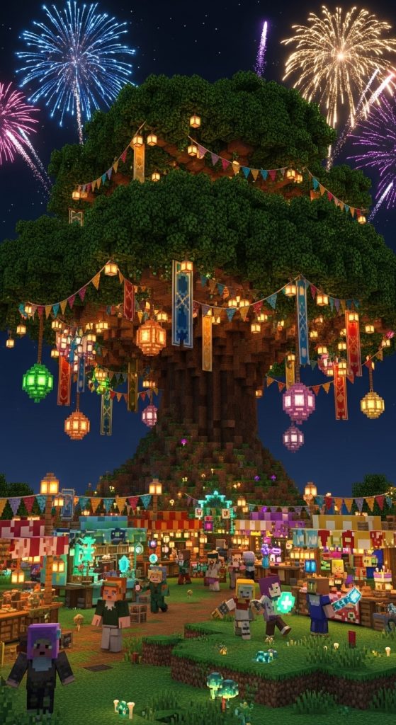 This idea is perfect for multiplayer servers or storytelling builds. It becomes a symbol of community, celebration, and joy, where players come together for events, festivals, or quests. Adding particle effects, glowing mushrooms, or magical lighting makes it unforgettable.