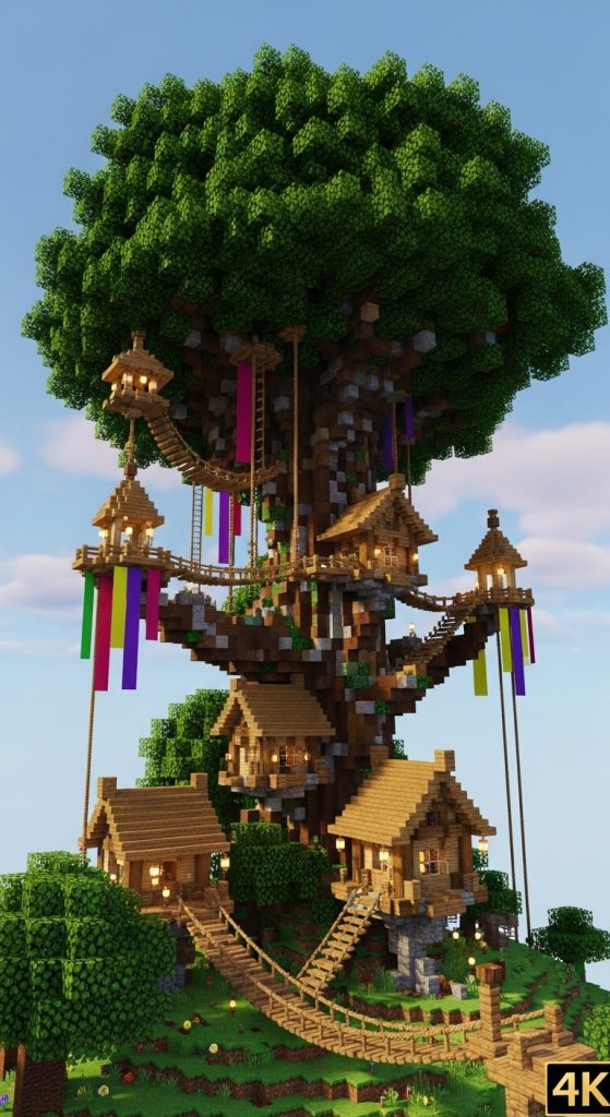 Decorate with cozy furniture, hanging baskets, and flower boxes. This type of build is perfect for storytelling and roleplay, giving life to a miniature ecosystem high among the leaves. Adding a community well, farms, or small gardens in the branches enhances realism.