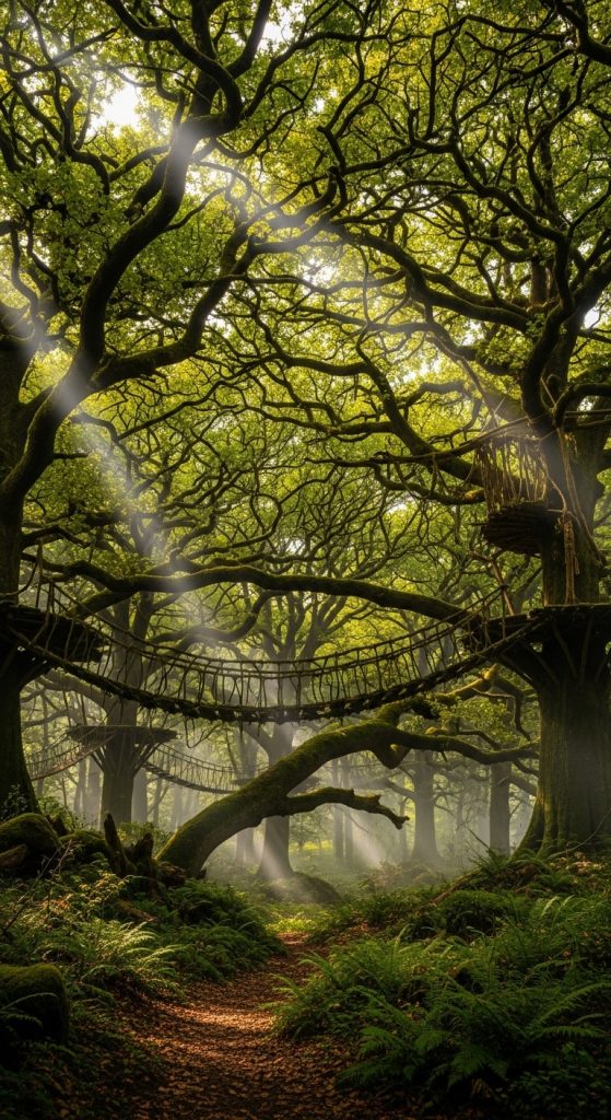 Add hanging bridges, vine-covered walkways, and small tree huts. The overlapping canopies allow for natural lighting effects, and sprinkling flowers, mushrooms, or even small creatures can bring the environment to life.