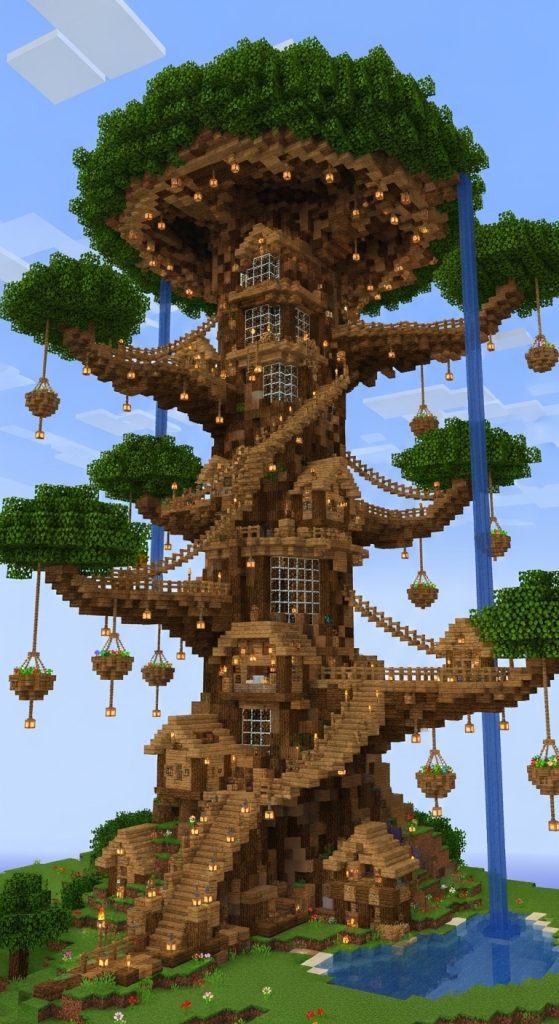This type of build is perfect for adventure maps, as players can discover hidden treasures or magical portals tucked among the branches. Adding a waterfall that cascades from the tree’s upper branches creates a mesmerizing visual effect.