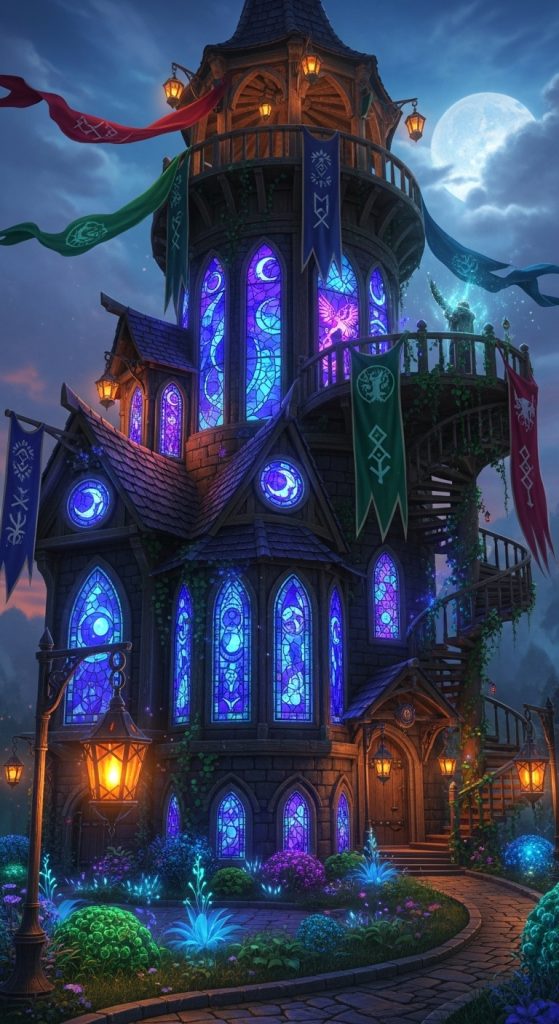 For a touch of fantasy, incorporate enchanted features into your medieval tower. Use stone as the base but add stained glass windows in blues or purples for magical aesthetics. Hanging lanterns or glowstone can illuminate the tower at night. Add rooftop spikes or banners with mystical symbols to enhance the enchanted feel. Surrounding small gardens or magical fountains increase the visual charm of your outpost.