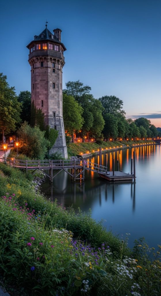 Waterfront towers serve both strategic and aesthetic purposes. Build a stone or wood tower beside a river, creating a dock or small pier at its base. This type of tower can guard trading routes or crossings. Surround it with fences and lanterns to prevent hostile mobs from approaching. The reflection of the tower in the water adds a photogenic quality, making it Pinterest-ready.