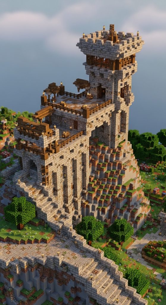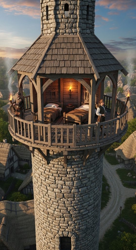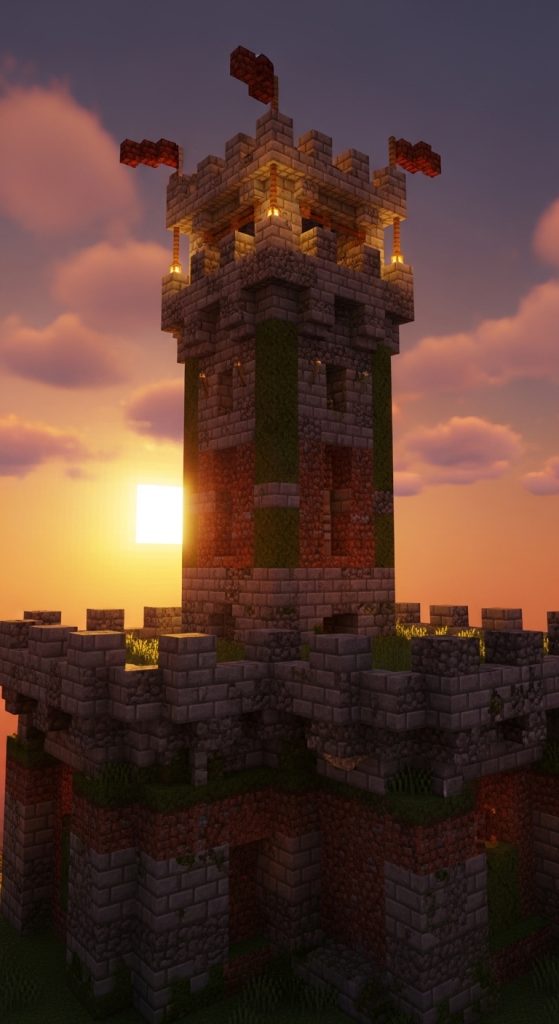 Combine utility and style by building a watchtower with a small living area for guards. A wooden balcony wraps around the stone tower, providing observation points, while a tiny room at the top or middle level can include beds, crafting tables, and storage. This makes your tower feel lived-in, perfect for survival mode. Decorative torches, flower pots, and armor stands add realism.