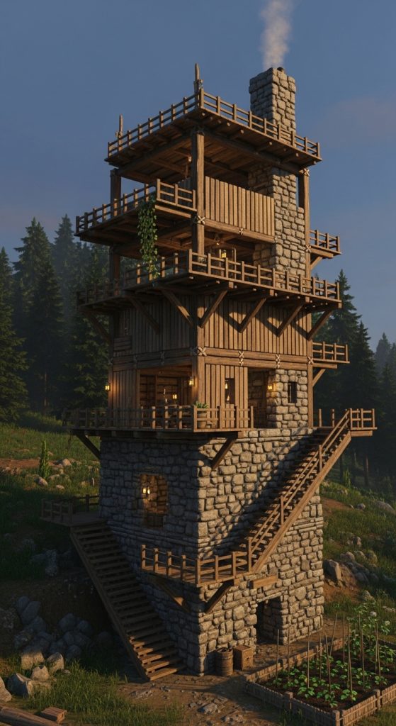 Add complexity to your outpost with a multi-level tower. Combine stone for the lower levels and wood for upper floors, creating a visually interesting structure. Each floor can have a specific purpose: storage, lookout, or guard quarters. Wooden balconies and staircases add architectural flair, while torches and lanterns bring warmth. Multi-level towers are highly functional in survival mode and make your outpost visually impressive.