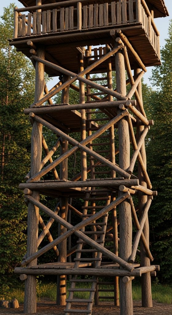 A wooden timber watchtower brings rustic charm to your medieval outpost. Use oak and spruce logs for the framework, with planks filling in the walls. The elevated platform at the top provides an excellent vantage point, and ladders or staircases give access to different levels. Rope fences or trapdoors can serve as guardrails, adding depth to the design. This type of tower blends well with forested biomes or small village outposts.