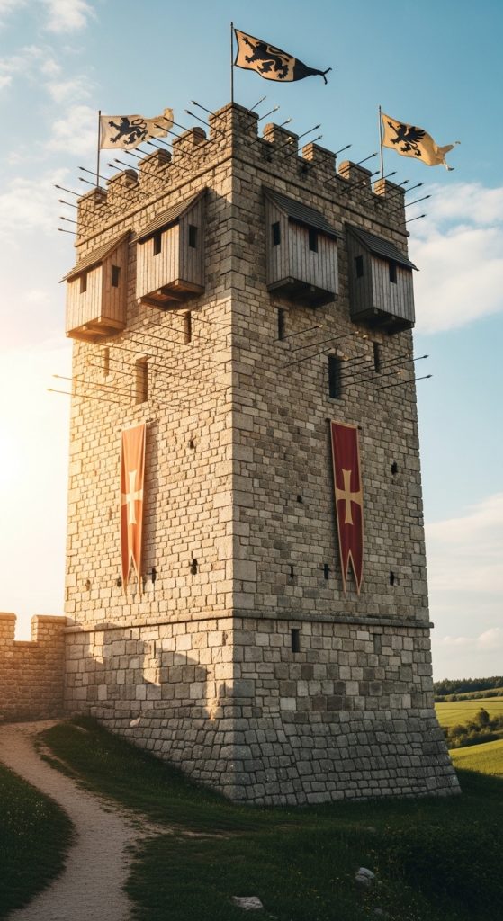 Elevated towers give a commanding view of the terrain. Build your medieval tower atop a hill, adding layers of stone walls that taper upwards. A lookout deck with wooden fencing ensures safety while maintaining visibility. Surrounding terraces with stairs and garden areas enhance the natural medieval look. This type of tower is ideal for establishing a stronghold or border outpost.