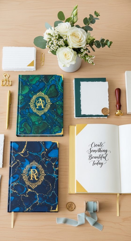 A personalized notebook combines practicality with luxury. Use blank journals and embellish the covers with marbled paper, pressed flowers, or hand-painted designs. Add a monogram, gold foil lettering, or a wax seal for an added touch of sophistication. Every page inside becomes an invitation to creativity or reflection.