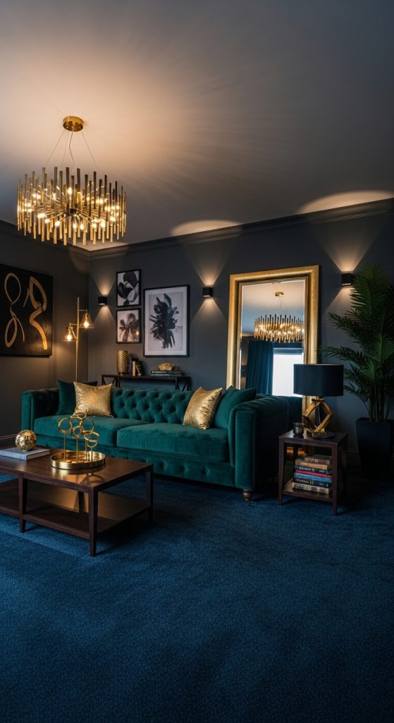 Deep shades like navy, charcoal, espresso, or forest green create a bold, dramatic foundation. Dark carpets ground the space and pair beautifully with metallic accents, velvet sofas, and statement lighting.