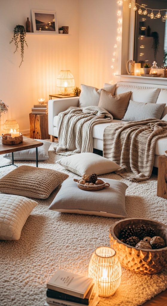 Choose neutral shag for sophistication or go with dusty pink, charcoal, or cream for a modern twist. Add floor cushions and warm lighting to complete the snug atmosphere.