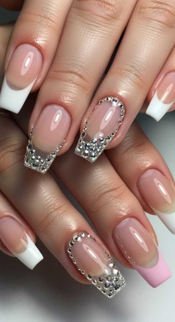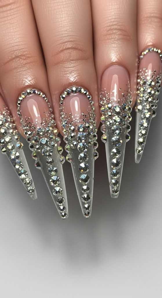 Pair with nude or jelly pink bases so the crystals stand out. Under flash photography, these nails look breathtaking — perfect for Pinterest glam boards.