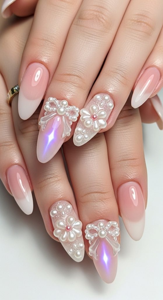 Blush nails — sheer pink with a soft airbrushed center — are trending across Pinterest. Add micro pearls arranged in bows, flowers, or cuticle crowns, and the look becomes ultra-luxurious.