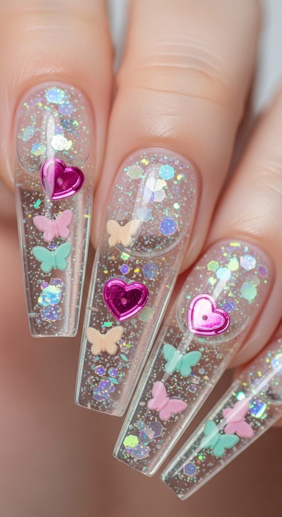 Aquarium nails are transparent extensions filled with glitter, sequins, or tiny charms that move inside liquid gel. Add cute elements like hearts, stars, or butterflies.