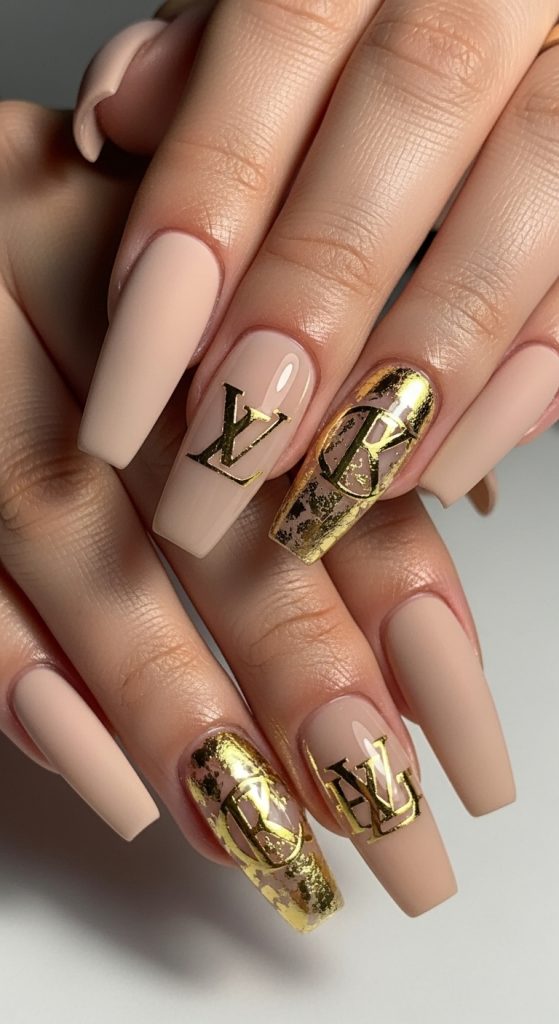 Luxury fashion meets nail art with designer-inspired accents. Think subtle logo decals, gold monograms, or pattern prints on one or two nails while the rest stay glossy nude or pastel.