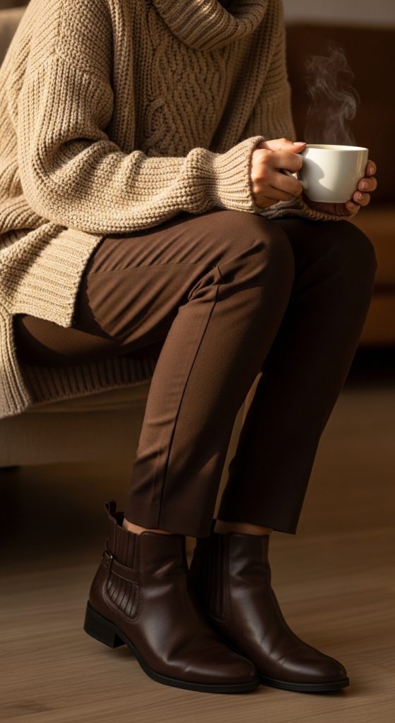 Layering is key to achieving a cozy, chic aesthetic. Combine brown pants with a fitted top and a long cardigan for a soft, elegant look. Neutral or earthy cardigans like beige, olive, or taupe work perfectly. Pair with ankle boots and a structured bag to balance comfort and sophistication.