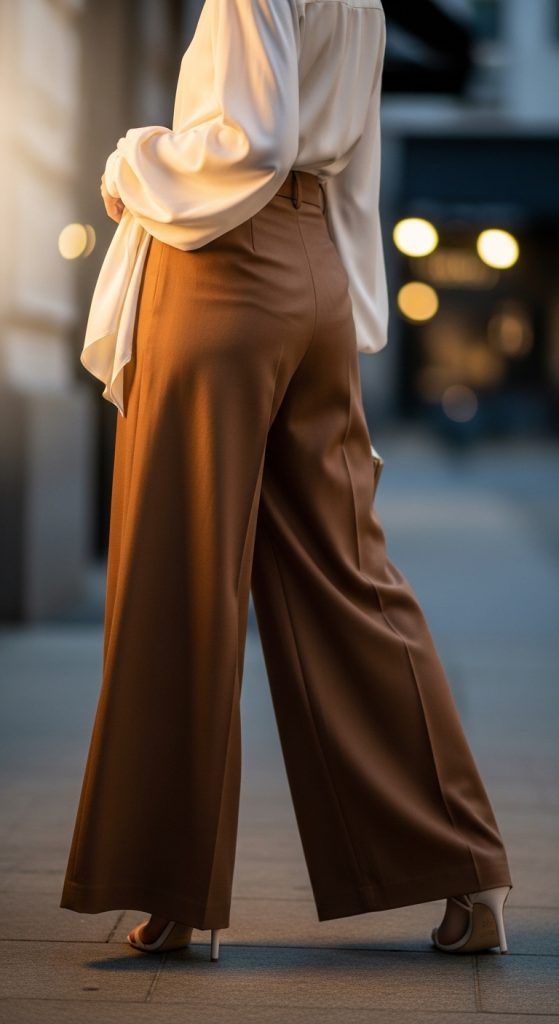 For an elegant evening or a semi-formal event, wide-leg brown pants with a silk blouse create a sophisticated silhouette. Choose soft, flowing fabrics to balance the structure of the pants. Complete with strappy heels and statement earrings for a refined, feminine aesthetic that turns heads.