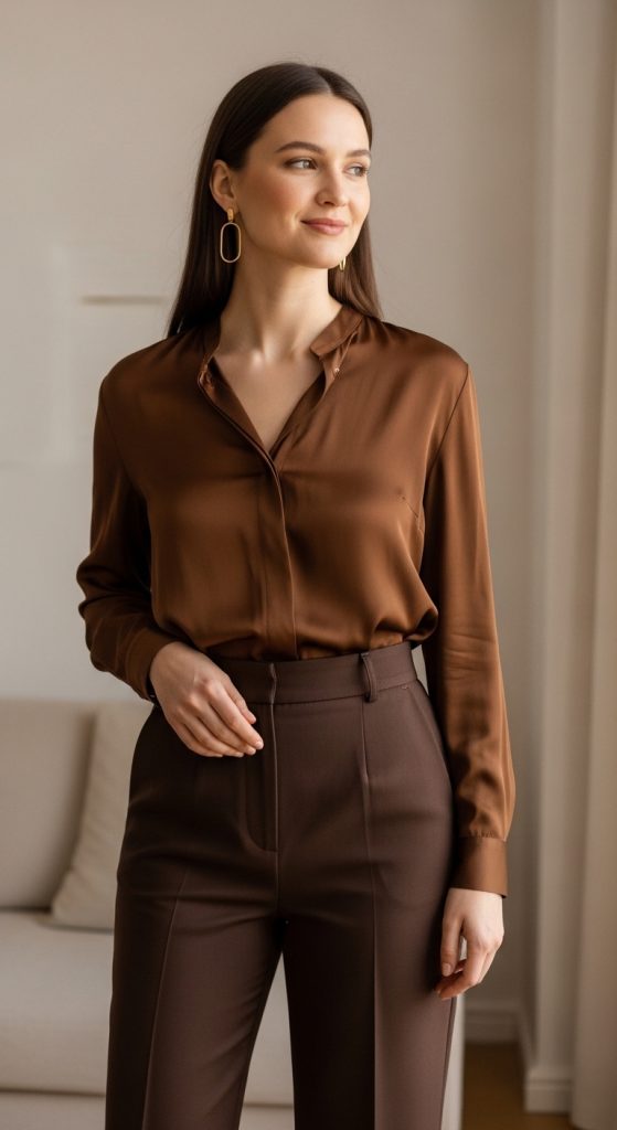 6. Silk Blouse and Wide-Leg Brown Pants