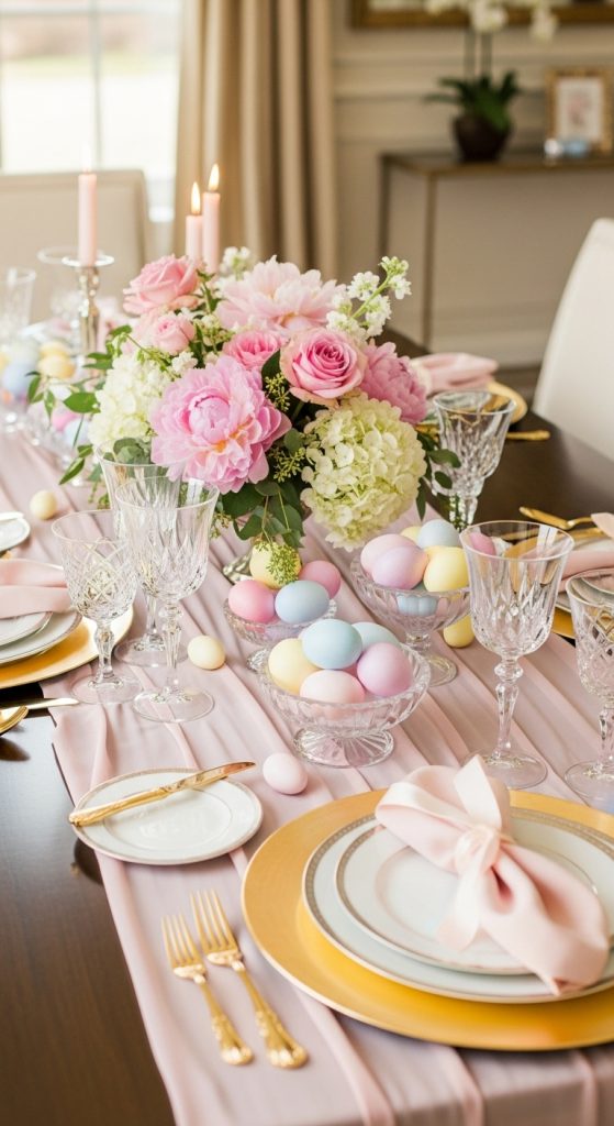 Transform your dining table into a dreamy pastel wonderland. Start with a soft blush table runner and complement it with gold-rimmed plates, cutlery, and glassware. Incorporate pastel-colored Easter eggs nestled in delicate bird’s nests or crystal bowls. Add a centerpiece of white lilies, pale pink roses, and hydrangeas in a gold vase to create a refined, airy atmosphere.