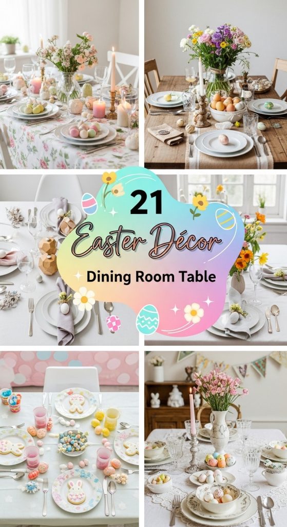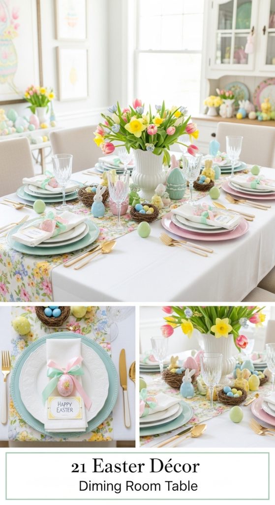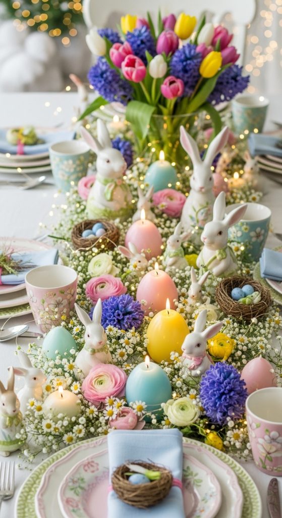 Turn your dining table into a magical Easter wonderland. Use pastel-colored tableware and a soft, floral table runner. Incorporate themed décor like ceramic bunnies, egg-shaped candles, and miniature bird nests. A whimsical floral centerpiece with tulips, daffodils, and hyacinths adds a fairytale touch. Add sparkling fairy lights or crystal accents for extra enchantment.
