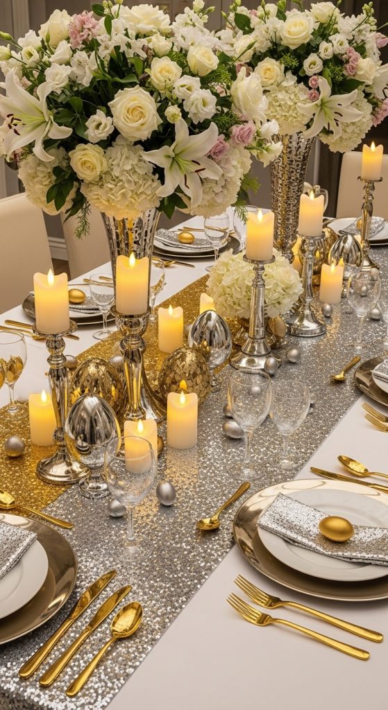 Make a bold statement with metallic tones. Use a shimmering gold or silver table runner on a white or cream tablecloth. Incorporate metallic plates, cutlery, and glassware. For the centerpiece, consider tall metallic vases filled with white and pastel flowers. Metallic Easter eggs, candle holders, and small sculptures can be scattered to create a sparkling, luxurious atmosphere.