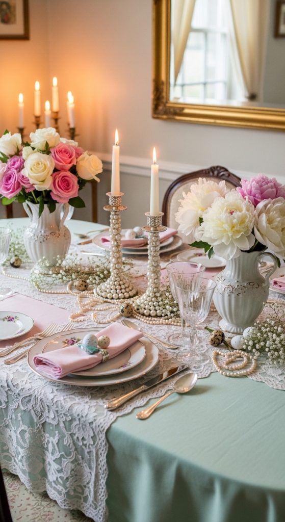 Combine vintage charm with opulent touches for a unique Easter table. Use a lace table runner over a rich pastel tablecloth. Place pearl-adorned candleholders and ornate vintage silverware on each setting. Soft-colored roses, peonies, and ranunculus in antique vases serve as the perfect centerpiece. Scatter delicate pearl strands or faux diamonds for a subtle sparkle.