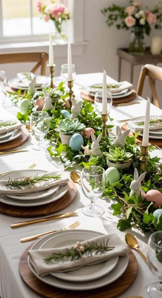Bring the outdoors in with a garden-themed table. Use a linen tablecloth in soft sage or cream and decorate with fresh greenery garlands, trailing ivy, and small potted succulents. Add ceramic bunnies, pastel eggs, and miniature birdcages for a whimsical touch. Finish the look with wooden chargers and natural woven placemats to maintain an earthy, luxurious feel.