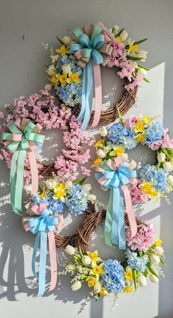 Use grapevine wreaths decorated with pastel florals, tiny eggs, ribbons, and greenery. Arrange them in an asymmetrical pattern for a modern touch.