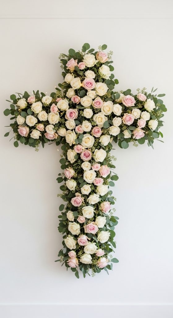 Attach flowers along a wooden or foam cross base, or create the shape directly with greenery and blooms. Surround it with fairy lights for a soft glow in the evening.