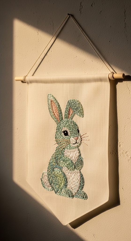 Soft fabric banners bring movement and texture to your walls. Choose linen or cotton banners with embroidered bunnies, carrots, florals, or Easter greetings.
