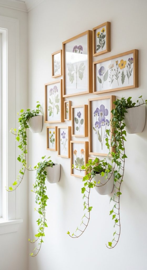 Use trailing plants like ivy or faux greenery to soften the edges of frames. The combination of art and living texture creates depth and organic beauty.