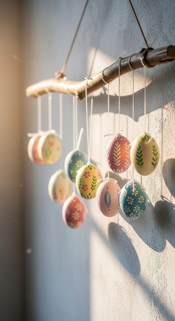 Instead of decorating just a tree, bring the magic to your wall. Suspend decorative Easter eggs at different lengths using transparent string from a curtain rod or wooden branch mounted on the wall.