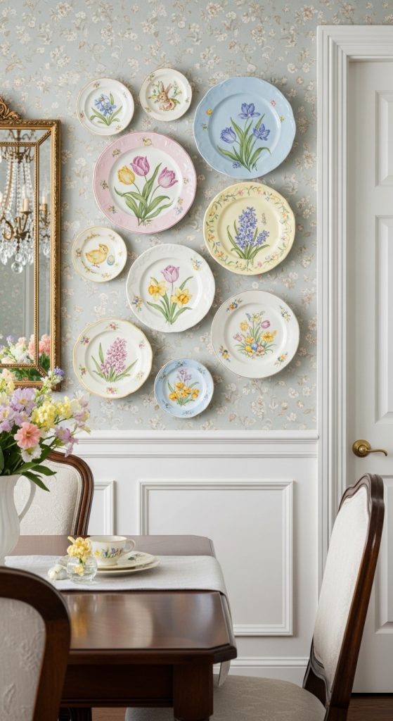 Vintage decorative plates featuring florals, pastel colors, or bunny illustrations can create a unique and elegant wall design.