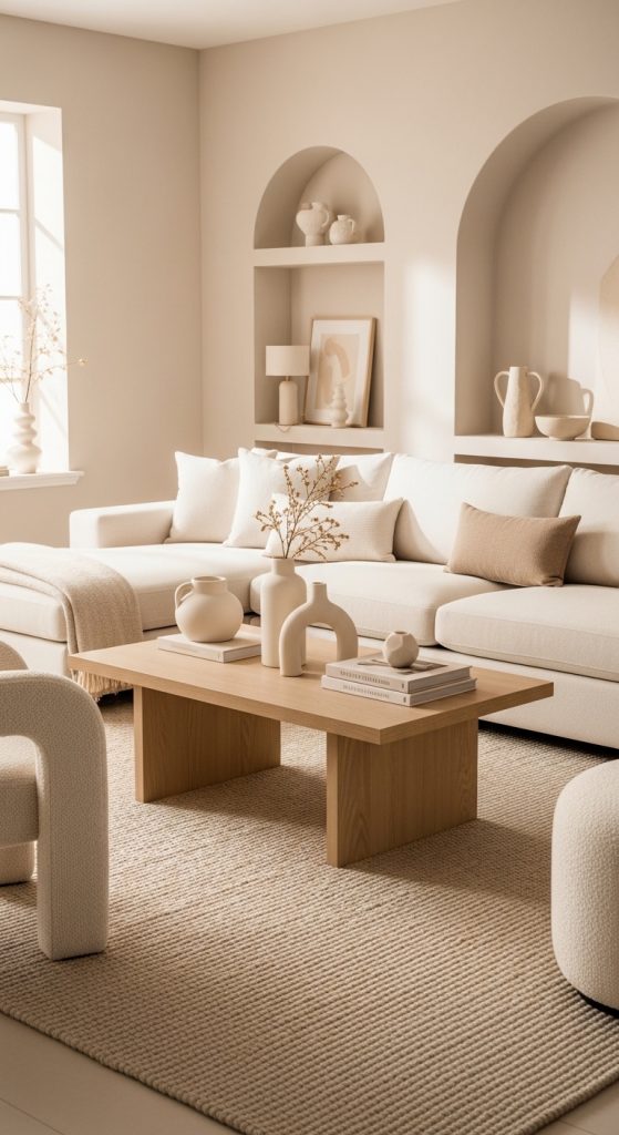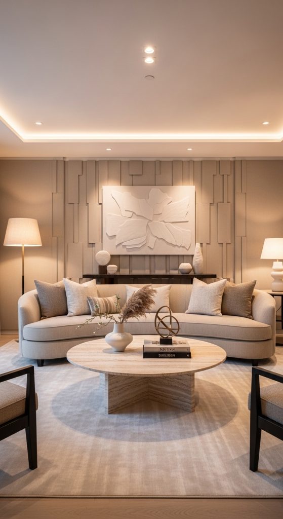 Layer different shades of beige, caramel, and sand tones. Choose a curved sofa, a round travertine coffee table, and textured wall panels for subtle dimension.