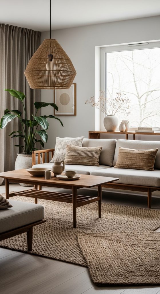 Think: light wood media unit, soft beige sofa, woven pendant light, and a large indoor plant like a fiddle leaf fig.