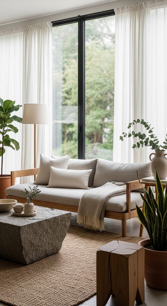 Use a neutral base palette with accents of sage green, clay, and muted olive. Choose sustainable materials like wood, linen, and stone.
