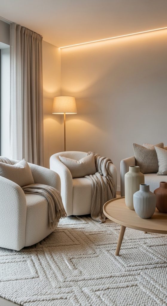 Layer boucle, wool, linen, wood grain, and matte ceramics. Keep colors neutral but mix surfaces to add depth.