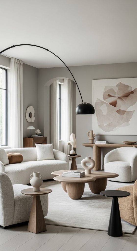 Think curved sofas, asymmetrical coffee tables, oversized arc floor lamps, and bold abstract art.